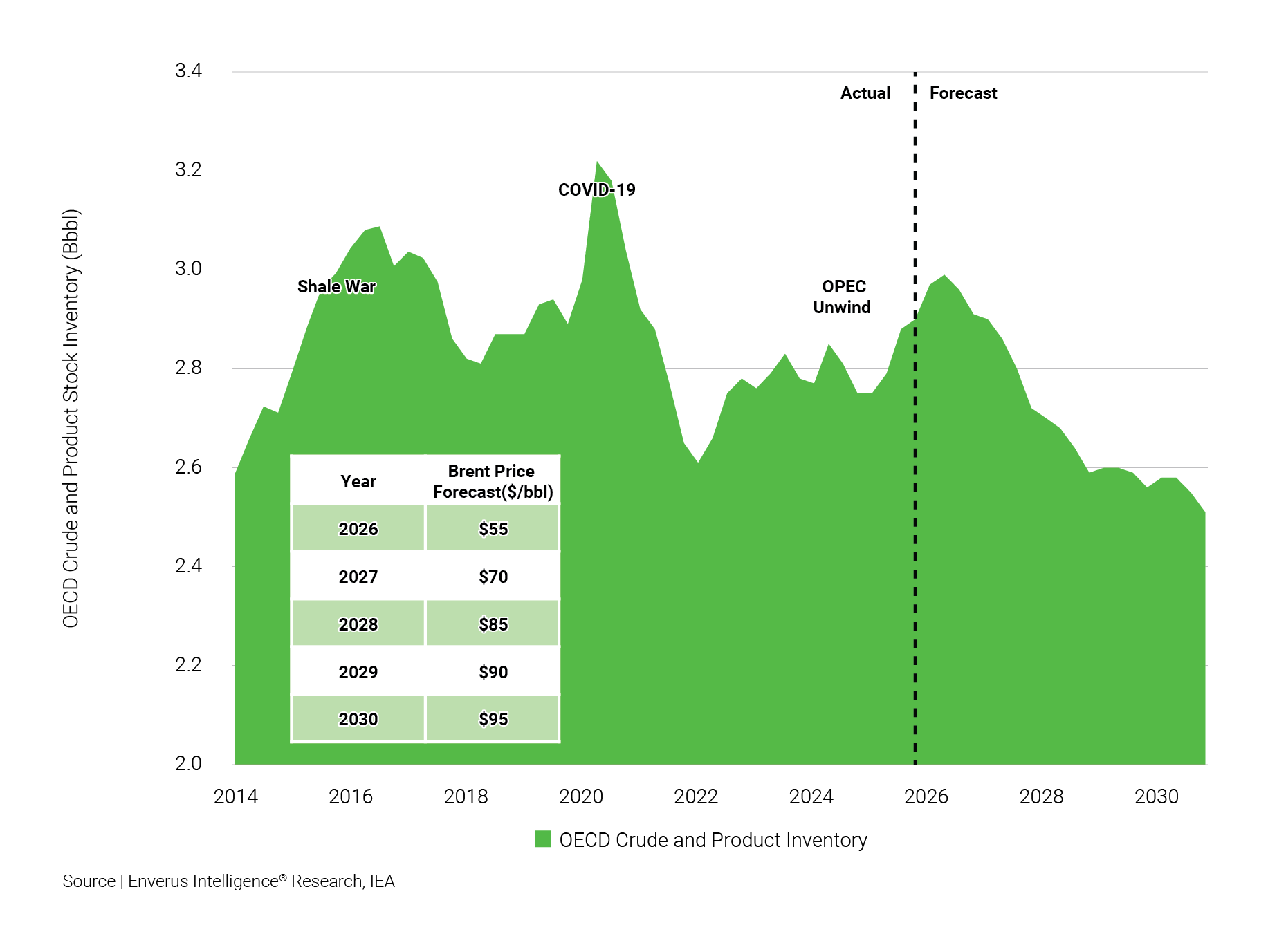 2026 is likely to be characterized by contrasting market dynamics. In the first half, notwithstanding upside risk from increasing geopolitical tensions, oil prices are expected to decline further as global inventories swell to levels not observed since the COVID-19 era and the U.S. shale price war. Global demand in the second half is projected to outpace supply, initiating stock draws and supporting a price recovery. Against this backdrop, Brent crude is forecast to average $55/bbl for 2026, reflecting the combined effects of early-year weakness and late-year stabilization.