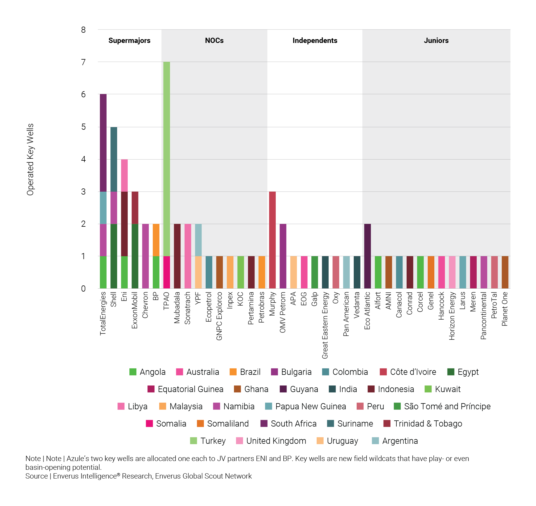 If activity proceeds as scheduled, we anticipate the long-awaited return of exploration capital to independents and junior operators. This shift marks a notable departure from recent years, in which supermajors led most high-impact campaigns. In fact, supermajors account for only 30% of planned key wells, down from 40% in our 2025 and 2024 outlooks, highlighting their relative decline.