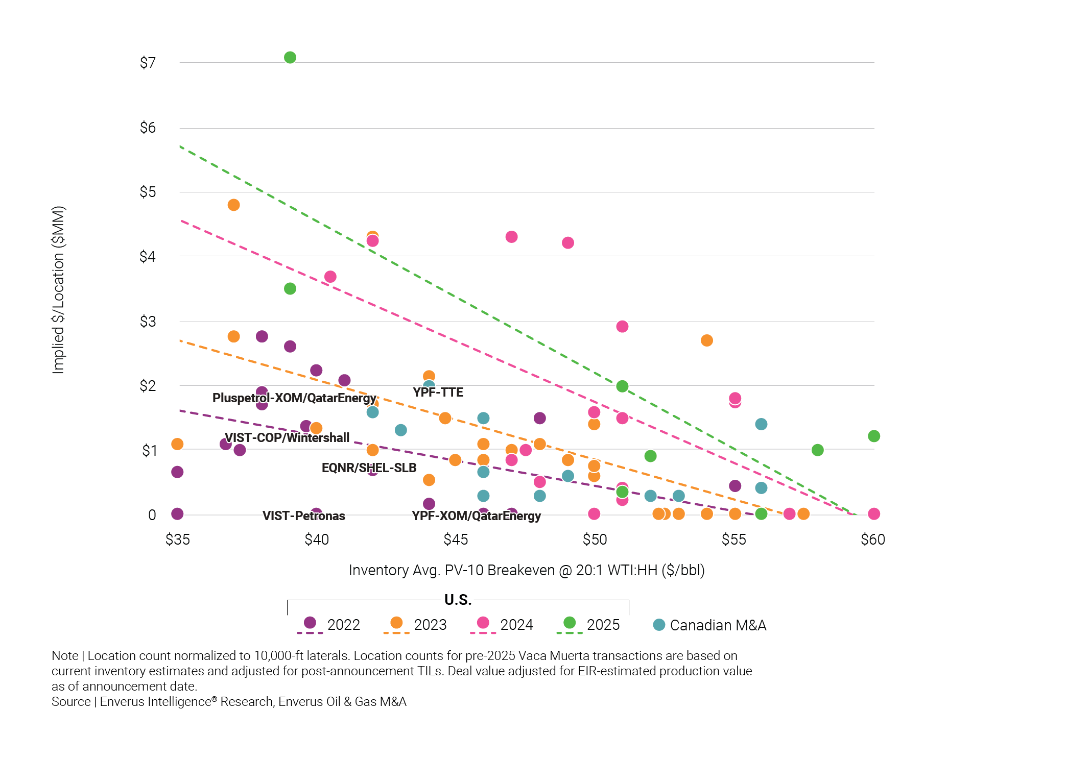 Looking ahead, we expect deal activity to accelerate, supported by three key factors: rising demand from inventory-constrained North American producers, pro-industry regulatory tailwinds in Argentina and early exits from some of the play’s more willing sellers. These dynamics point to upward pressure on valuations and a narrowing of the gap with economically comparable North American inventory. Specifically, sellers are likely to seek more than $0-$2 million per location for sub-$45 breakeven inventory, reflecting improved market confidence and competitive bidding.