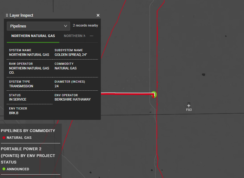 Overlay proximity to natural gas infrastructure and gather related details including pipe owner, diameter, and status.