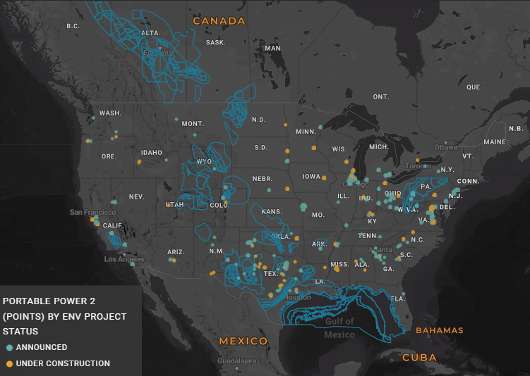 Identify on a map the announced and under-construction data center projects across the U.S., including ownership, status, estimated first power date.