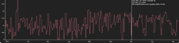 The available withdrawal capacity (AWC) is how much energy can be taken from the grid at any given time without causing issues with other users or causing brownouts. The average daily minimum capacity is the amount of power that can be generated by a facility on any given day, regardless of demand. This number should be high enough to ensure that there will always be enough power available for data center operations. With Enverus Panorama, users can assess AWC across hourly, daily, weekly and monthly intervals for a bus.