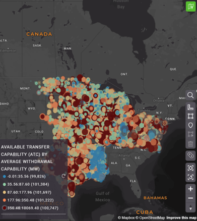 In addition to historical withdrawal capability, developers need to understand how capacity will change in the future. Using outputs from ISO planning models, users can understand withdrawal capacity across different future scenarios such as peak load assumptions in the next 5 years. This information, paired with historical trends, helps determine whether a stie can consistently meet baseline load requirements and if it will do so in future grid scenarios.