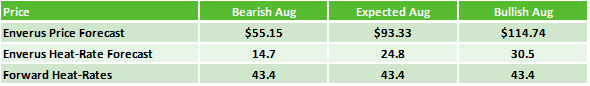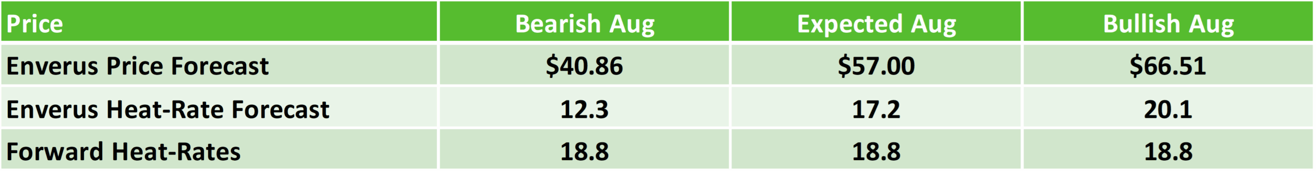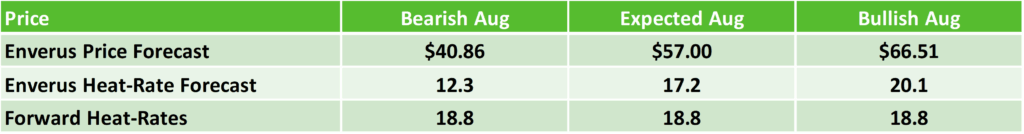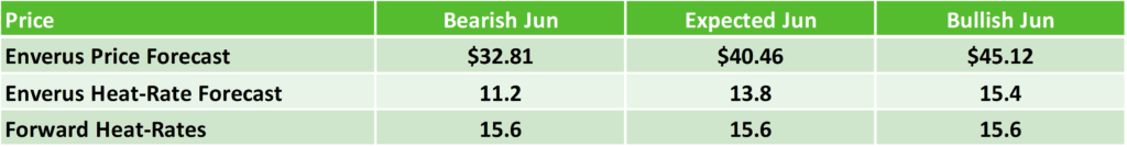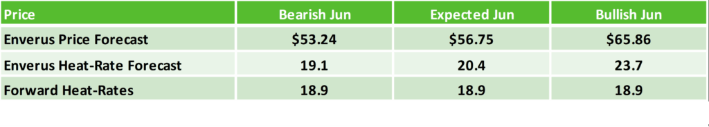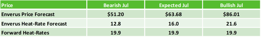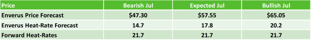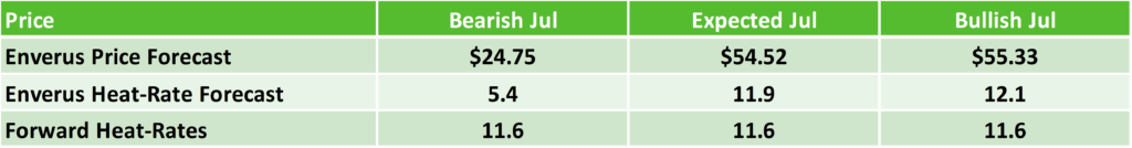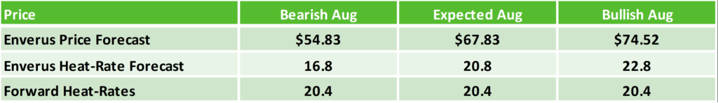 Our view for above average load and a risk for well below average hydro-generation during the month is framing our Mid-C heat rate at 16.9. It appears the market likes the risk premium for a “heat wave” like event combined with below average hydro generation. Enverus likes that scenario, too, and our bullish scenario reflects that possibility.