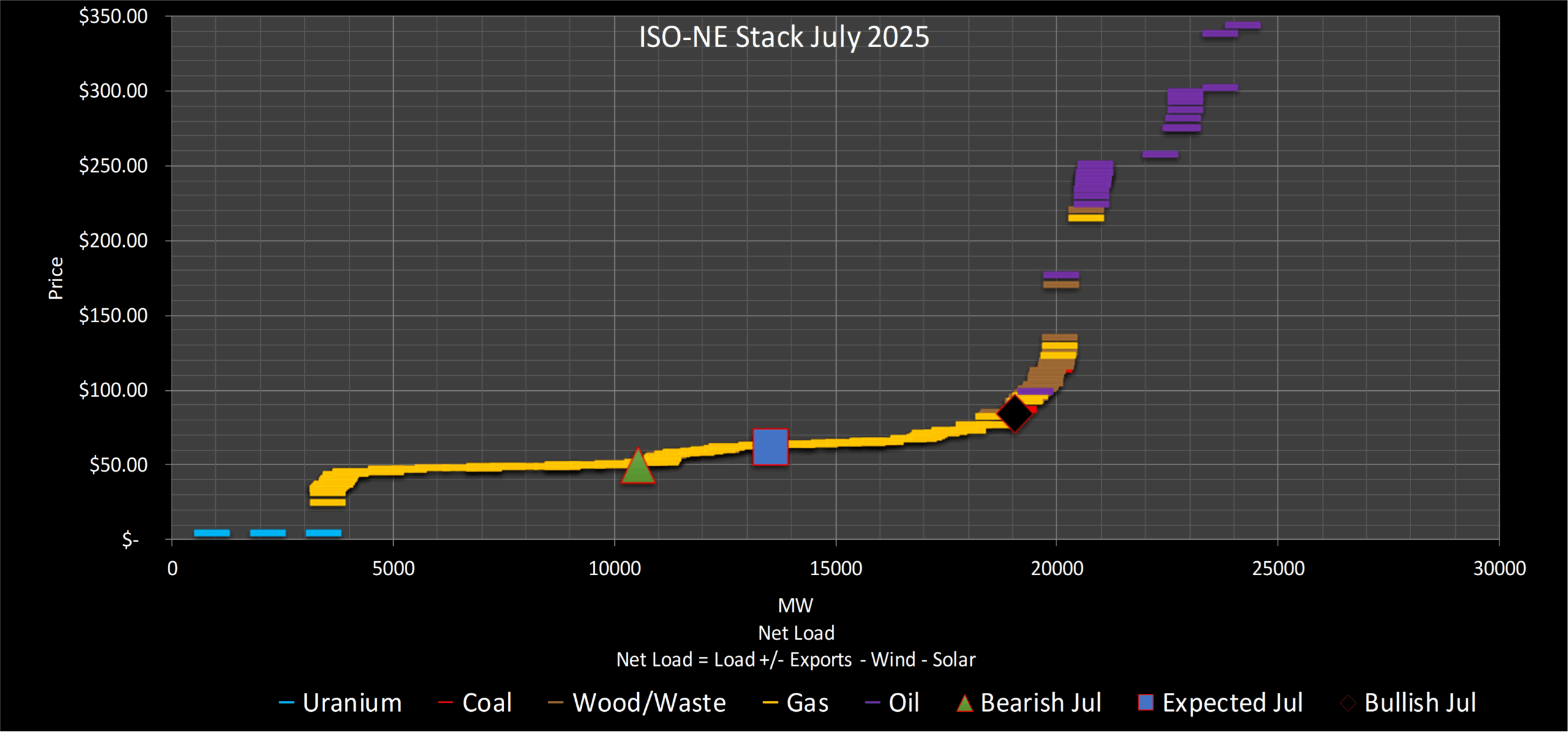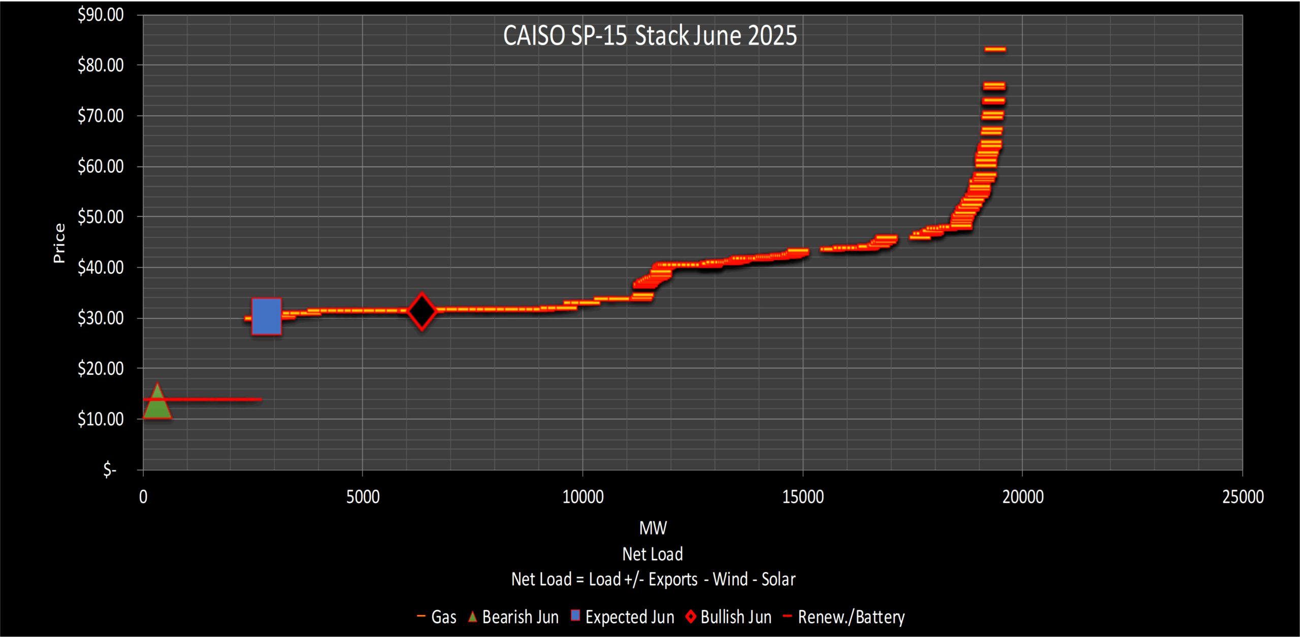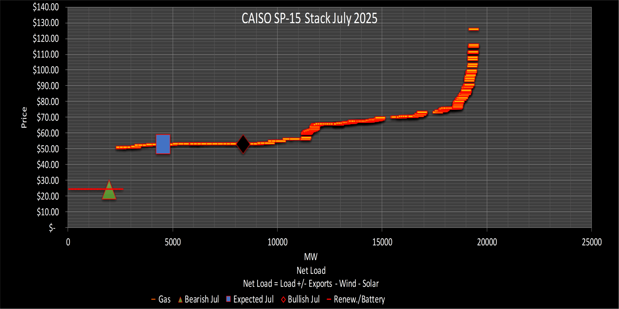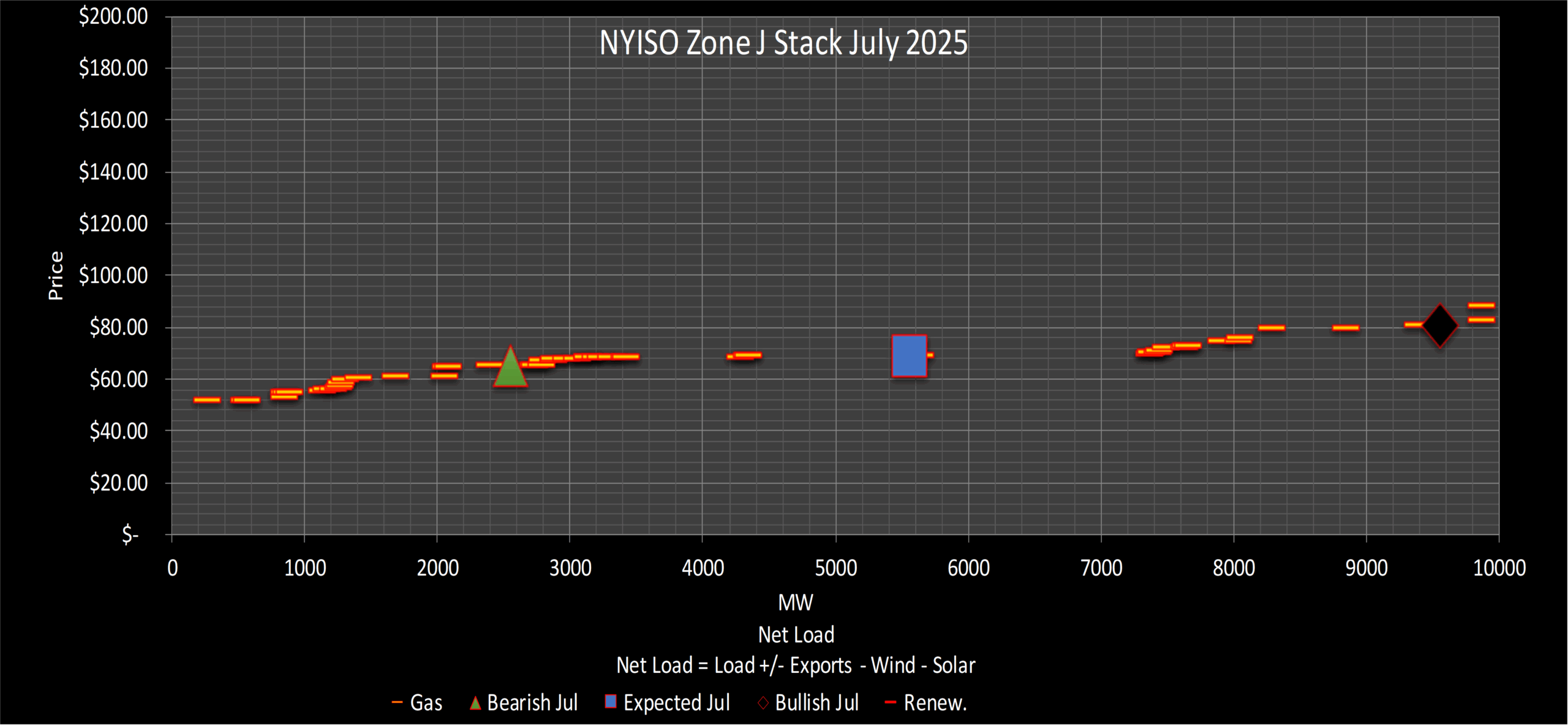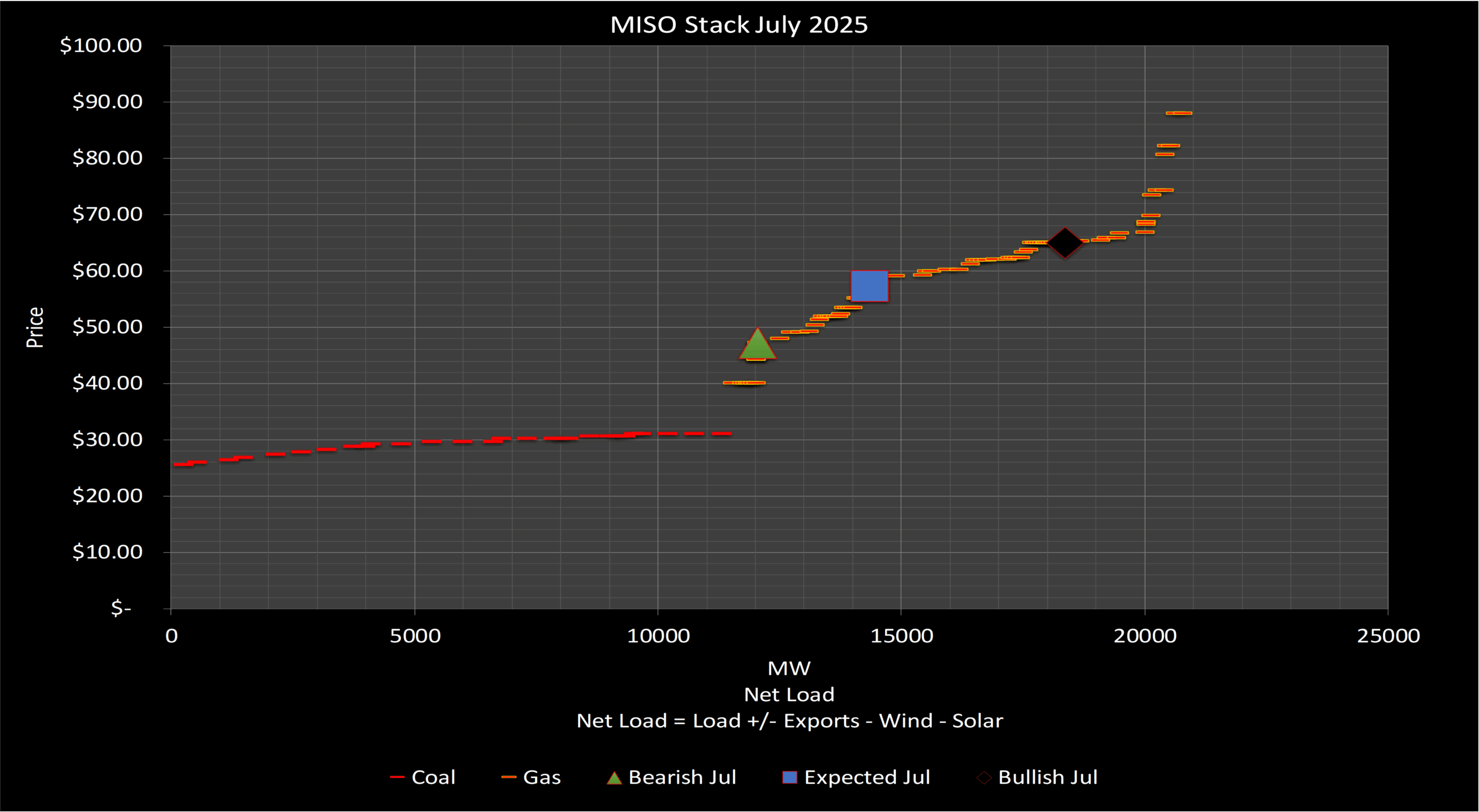 Our view for below average load and a risk of above average wind puts our forecast well below the market. If the market is pricing July to be off the stack most of the month, in scarcity conditions, and this would be the case if the month turns out to be hot (above average load) with below average wind. If this is the case the market outlook could be on the mark.