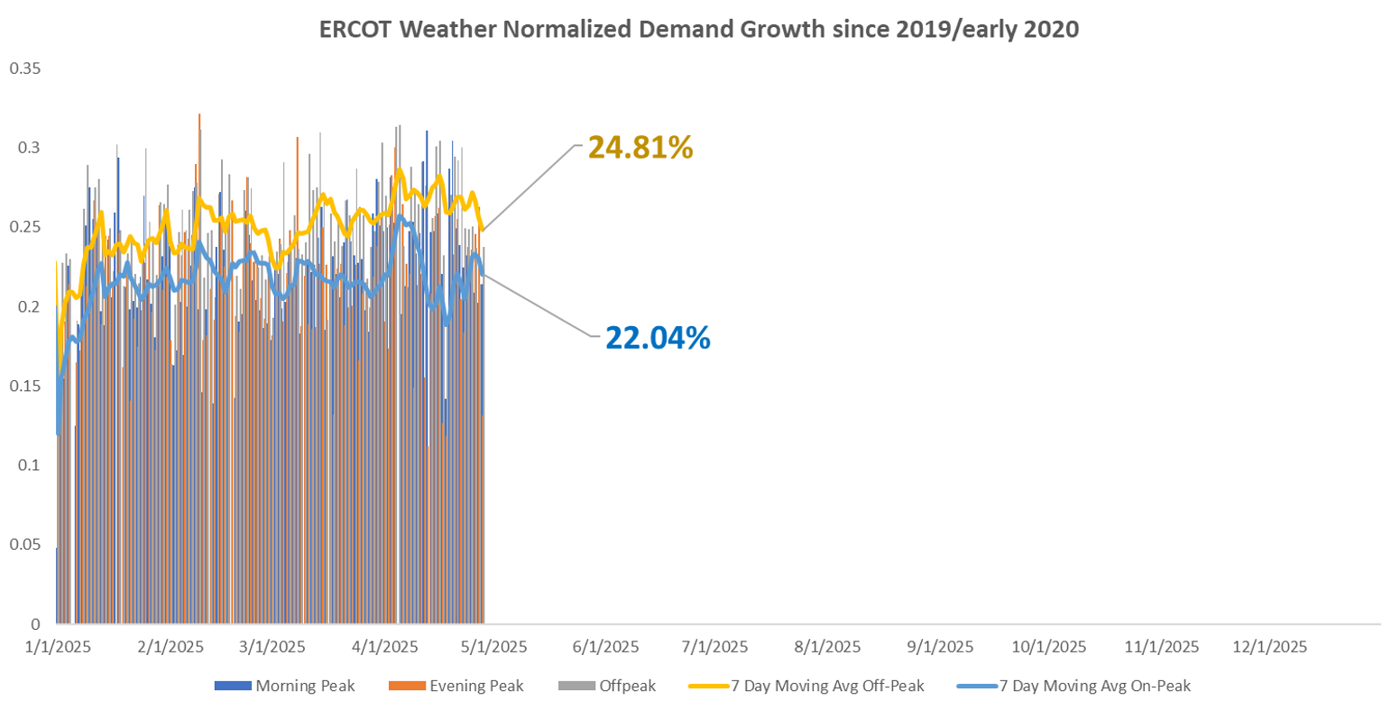 ERCOT anticipates 5–6% year-over-year weather normalized load growth, driven by continued demand increases and reduced behind-the-meter solar exports that deepen the “duck curve” ramp requirements. Since last summer, ERCOT added 234 MW of wind, 5 GW of solar and 3 GW of battery capacity, amplifying morning and evening ramp needs. The summer in ERCOT is expected to be cooler than average with short duration heat waves possible.