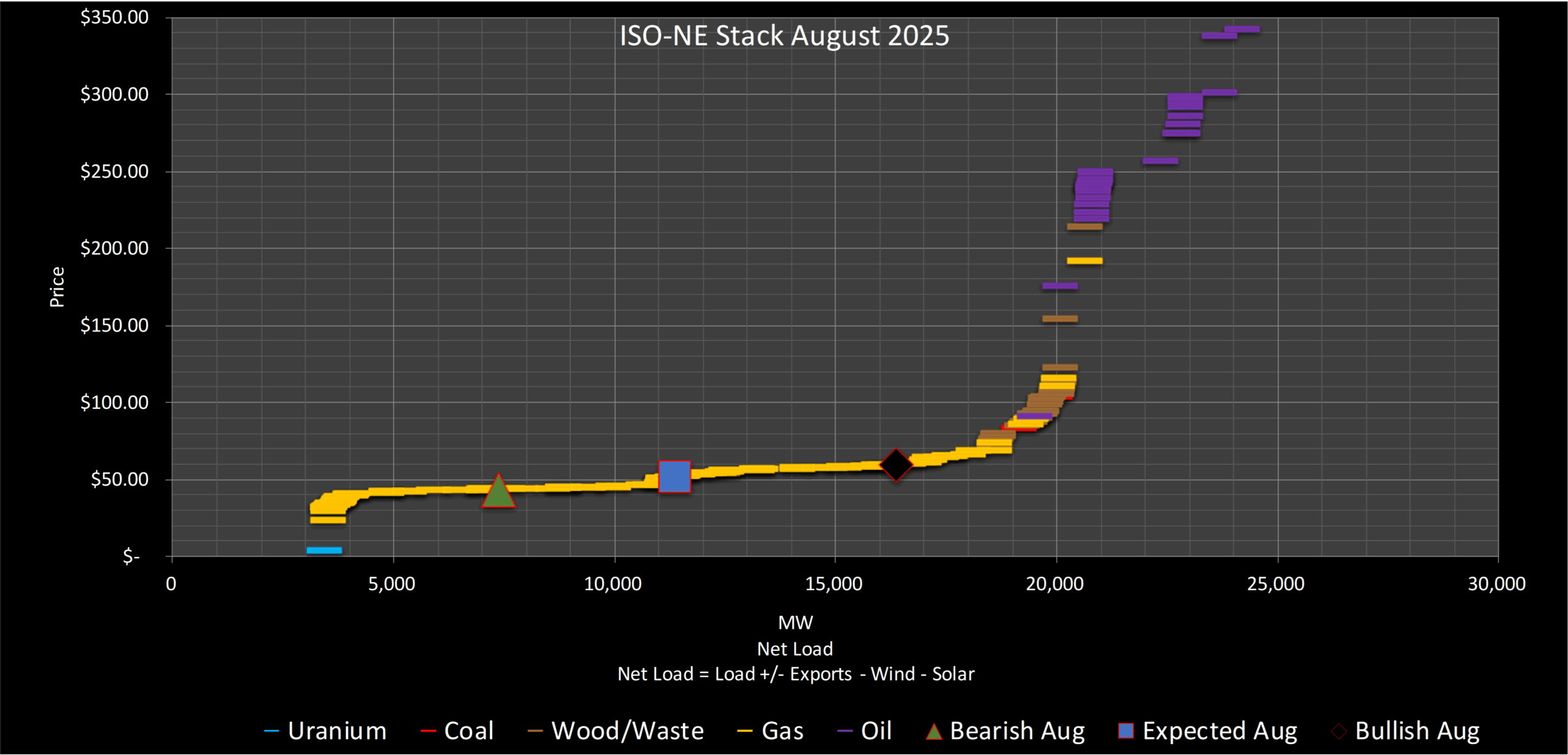 Our load forecast for August is below average driven by below seasonal temperatures. Our current base case scenario is below the market. Any heat wave like our analog year 2017 or last year will increase the risk of bullish prices in ISONE.