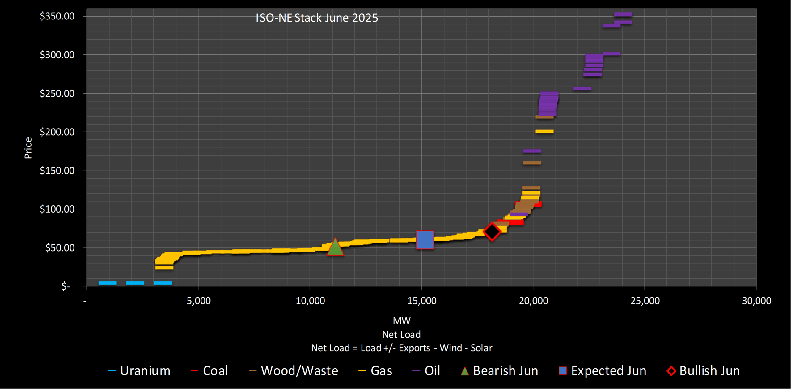 For the first month of summer our outlook is bearish to the market as we expect Brandon Shores to run 2 units more frequently as they begin their RMR contract. This should help to mute much of the NOTT/CONA-NRTH congestion. The risk to our view, we are modeling roughly 2-3% load growth which combined with a “heat wave,” could push WHUB heat rates near our bullish scenario.