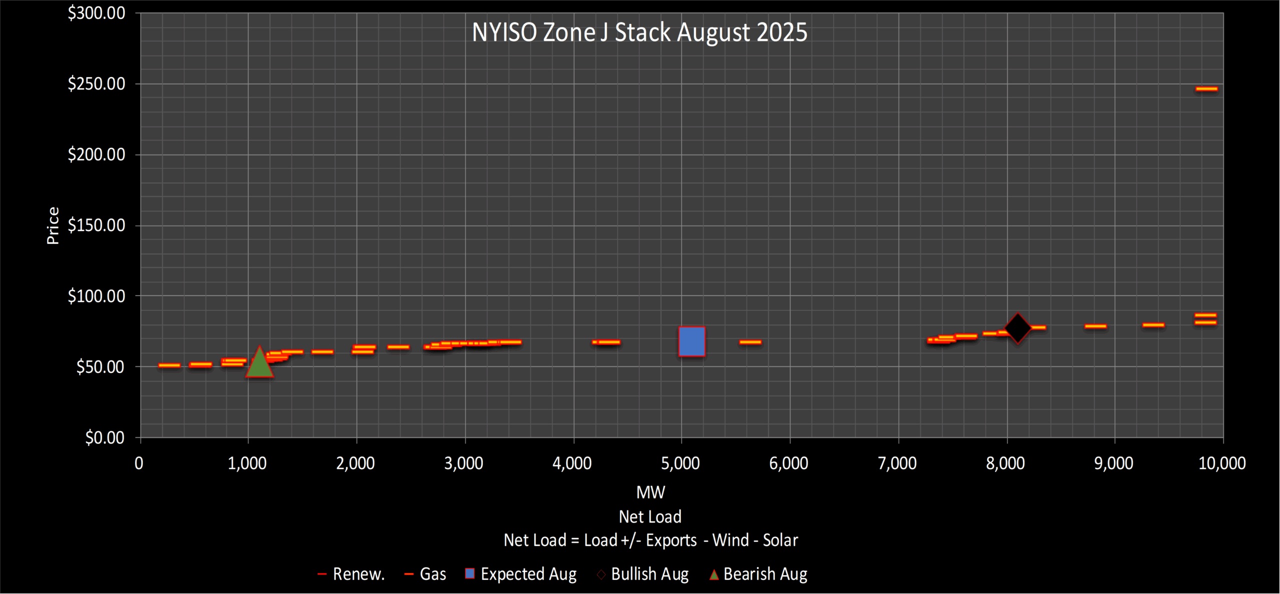 August will see below average demand in NYISO region driven by below seasonal temperatures. High demand in NYC can increase local congestion, which can have a bullish impact on the zone J prices.