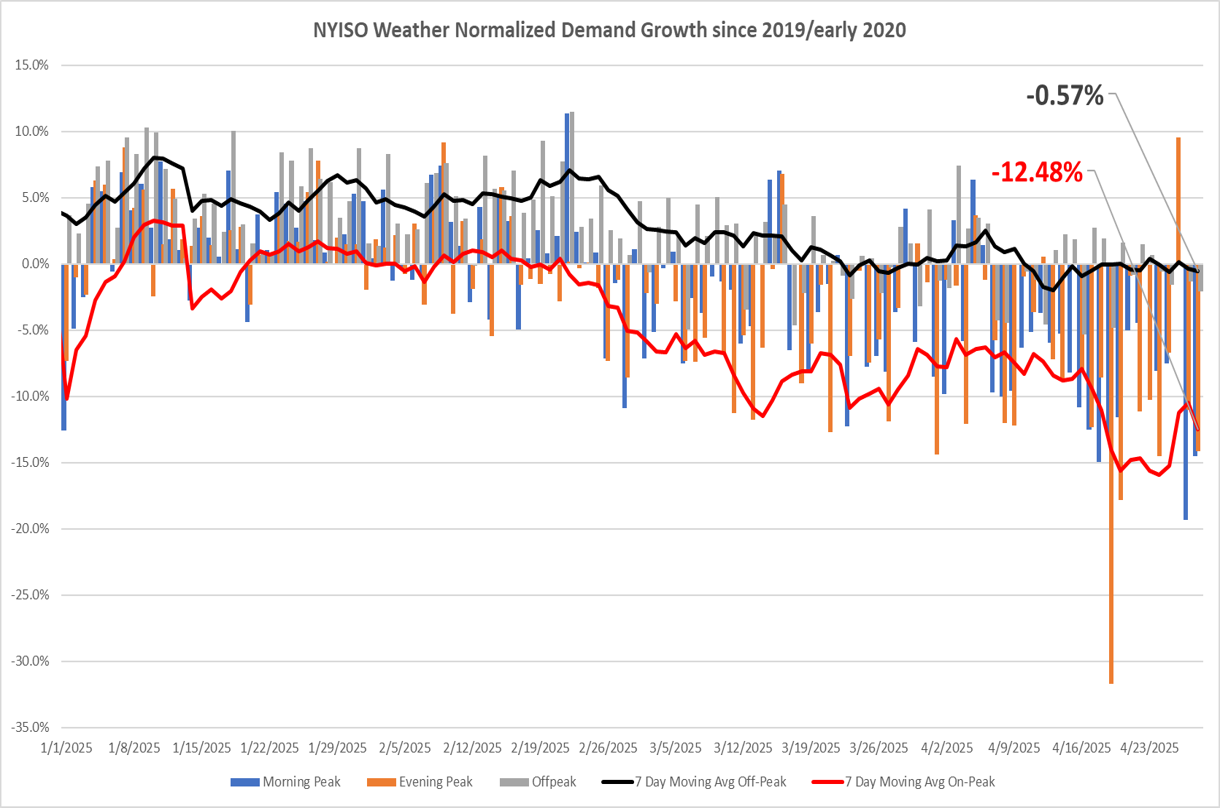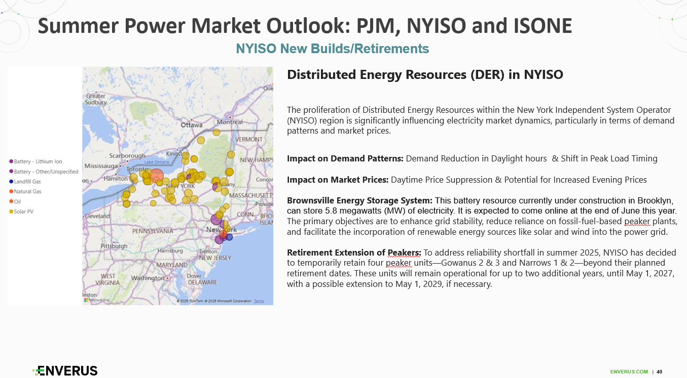 DER growth (solar + BESS) delays daytime peaks; on-peak load growth ~2% Y/Y. The summer in NYISO is expected to be cooler than average with short duration heat waves.