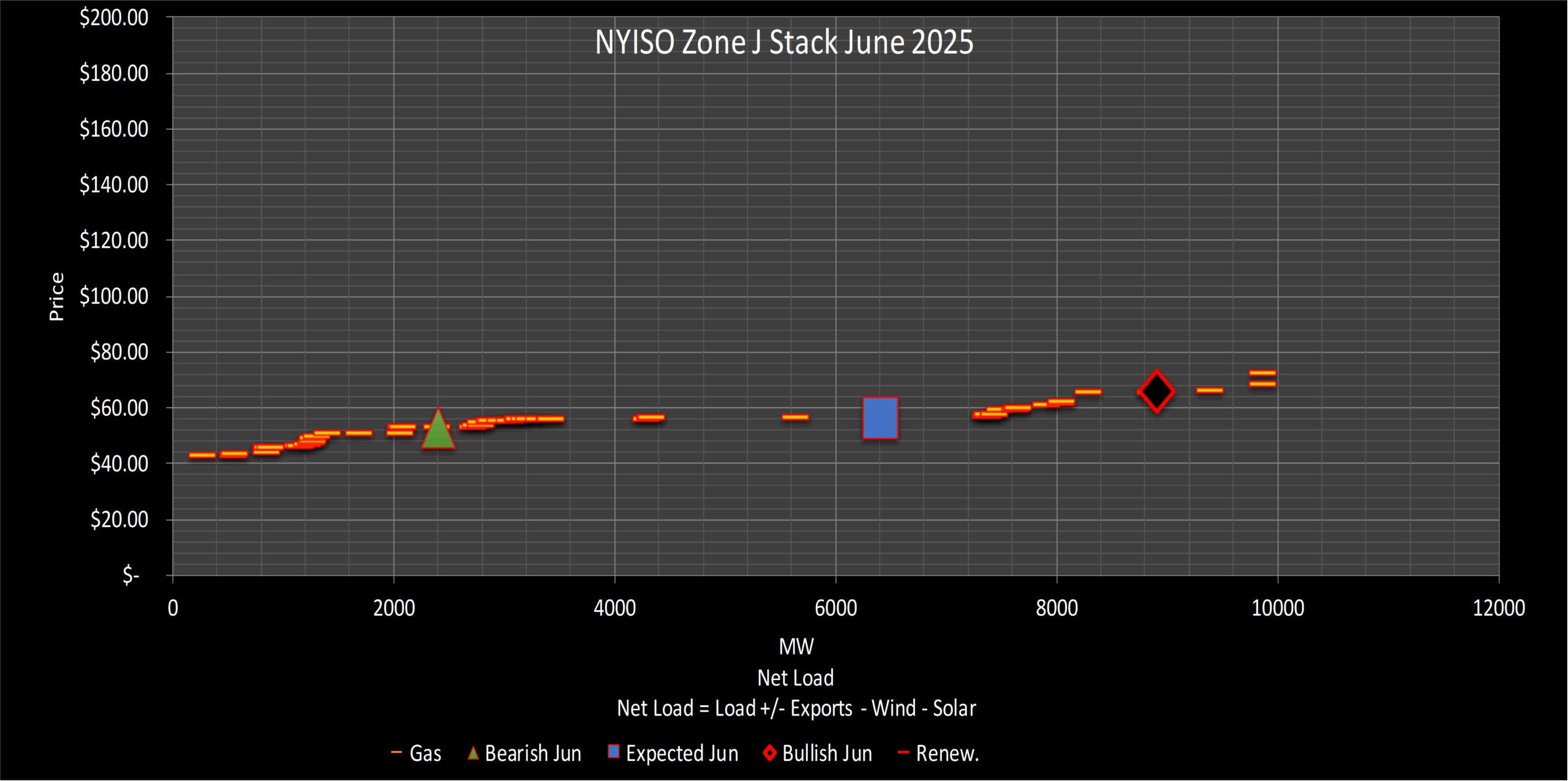 June will see average demand in NYISO region driven by mostly seasonal temperatures. Our current base case scenario is above the market. We see more risk of bearish prices in the month coming from below average load. Additional congestion can have bullish impact on the zone J prices during heat waves.