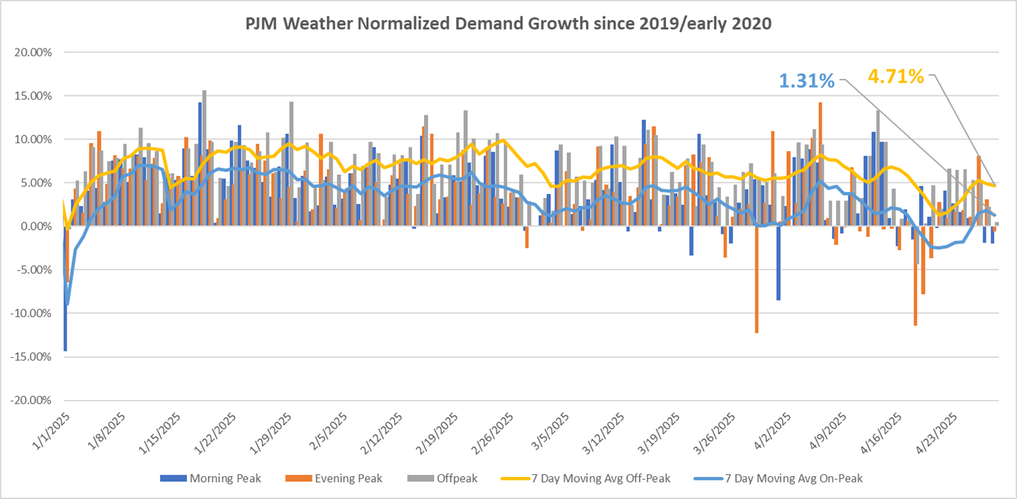 ENSO-neutral analog years indicate below-average temperatures. Weather normalized load growth is YOY 2–3%. The summer in PJM is expected to be cooler than average with short duration heat waves.