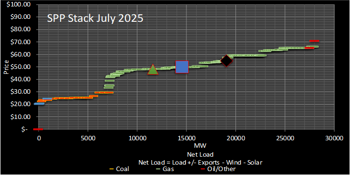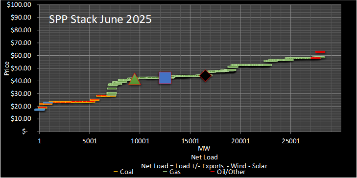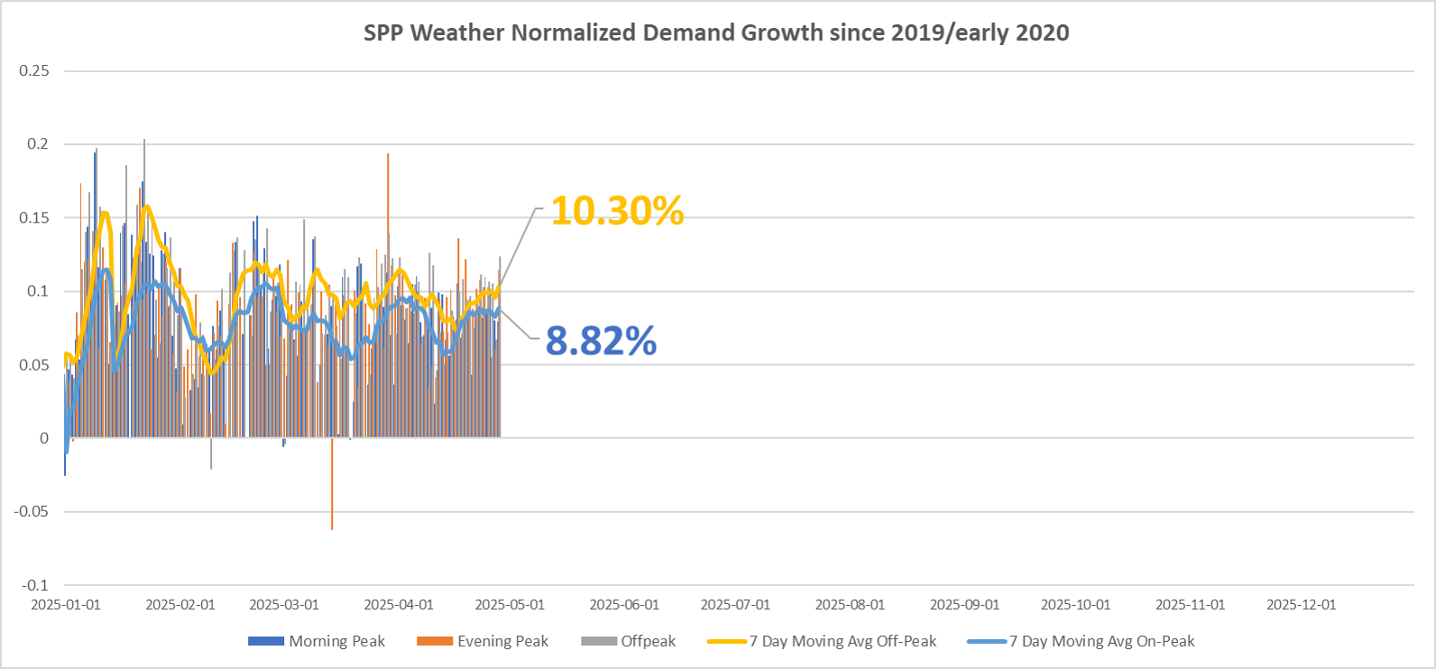 On-peak load growth is forecast at 2–3% YoY weather normalized load growth near 4–5%. Solar and batteries additions are modest, while larger wind projects are in the queue. The summer in SPP is expected to be cooler than average with short duration heat waves.