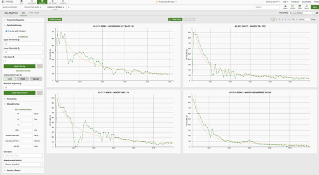 Forecasts are generated using established decline-curve methodologies applied to the defined well population. With Enverus Forecast Studio, you can change assumptions using data conditioning, segmentation, and manually edit Arps DCA parameters. Forecasts grounded in real performance are more defensible than generic basin-wide curves.