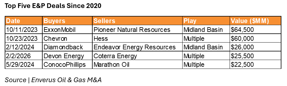 After a menu of smaller corporate transactions and asset deals in 2025, consolidation among large-cap E&Ps is back on the table with Devon Energy’s blockbuster $26 billion acquisition of Coterra Energy. The deal is comparable in size to Diamondback’s Endeavor purchase and the fourth largest upstream combination since 2020. It forms a company with a pro forma enterprise value of $58 billion. Coterra shareholders will receive 0.7 shares of Devon per outstanding share. That is around a 12% premium to the unaffected share price before rumors of the combination emerged in mid-January, but a slight discount to the company’s Friday close.