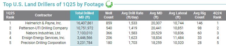 Included in the release is a compilation of exclusive tables showing the most active drillers by footage, ranking both the contractors and their customers. Powered by Enverus Core® data, these leaderboards also include average drilling speeds, measured depth (MD), laterals and rig counts, average fluid and proppant loads per foot, and comparison to their rankings the previous quarter. The list was featured in Oilfield Pulse, a bi-monthly report that covers the oilfield services sector, including contracts, the deal market, finance and new technology offerings.