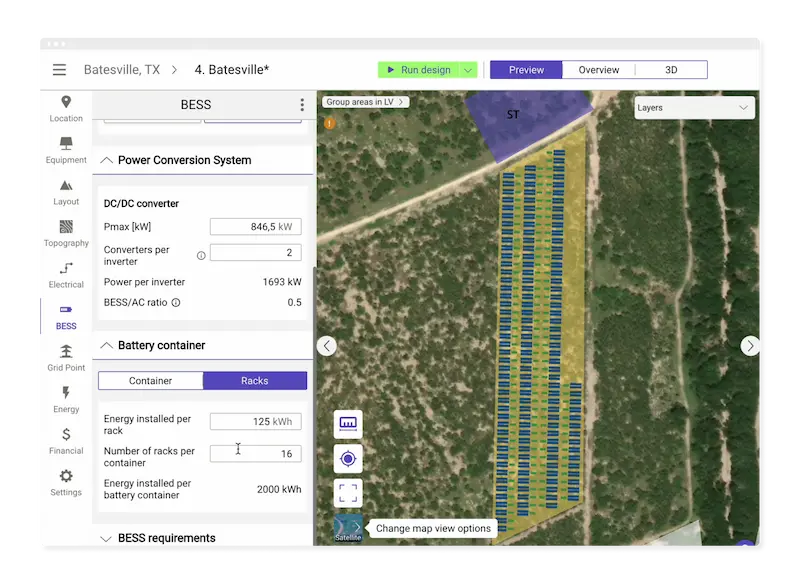 With RatedPower’s BESS design tool, you can seamlessly integrate battery storage with PV plants, supporting both AC- and DC-coupled configurations. Quickly optimize storage capacity, generate full engineering documents and compare AC vs. DC hybrid PV systems for cost and production efficiency. Automate your BESS layout generation, container placement and power factor adjustments while leveraging a comprehensive equipment library. You can also design standalone BESS projects with refined calculations for topography, earthworks and cable sizing.