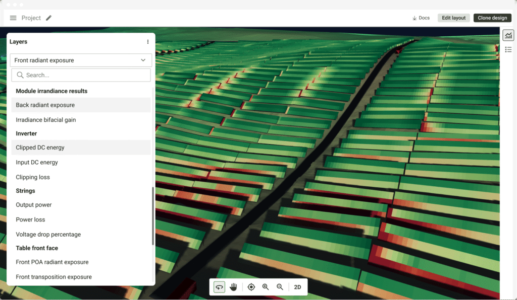 Leverage cutting-edge 3D energy technologies with ray-tracing and module-by-module analysis, validated by real company data, to access the most granular energy production estimates and build more accurate projects. Optimize your energy results, gain a competitive edge, and identify underperforming areas in your plant, editing them directly within the same software to achieve top-performing designs. Access hundreds of detailed technical documents in minutes and win over off-takers with more precise, high-confidence results.