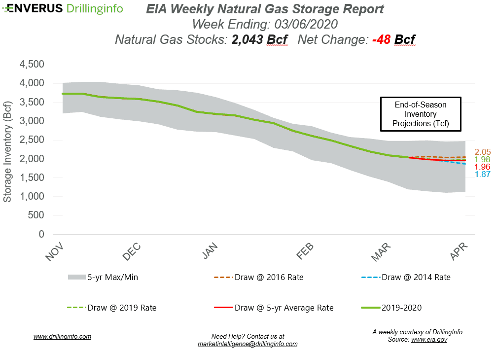 Natural gas storage inventories decreased 48 Bcf for the week ending March 6, according to the EIA’s weekly report. This was below the expected draw of 56 Bcf.