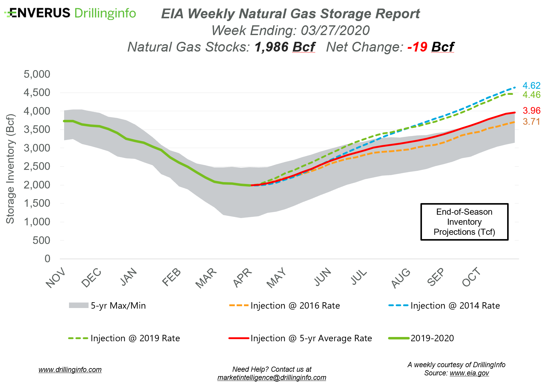 Natural gas storage inventories decreased 19 Bcf for the week ending March 27, according to the EIA’s weekly report. This was larger than the expected draw of 15 Bcf.