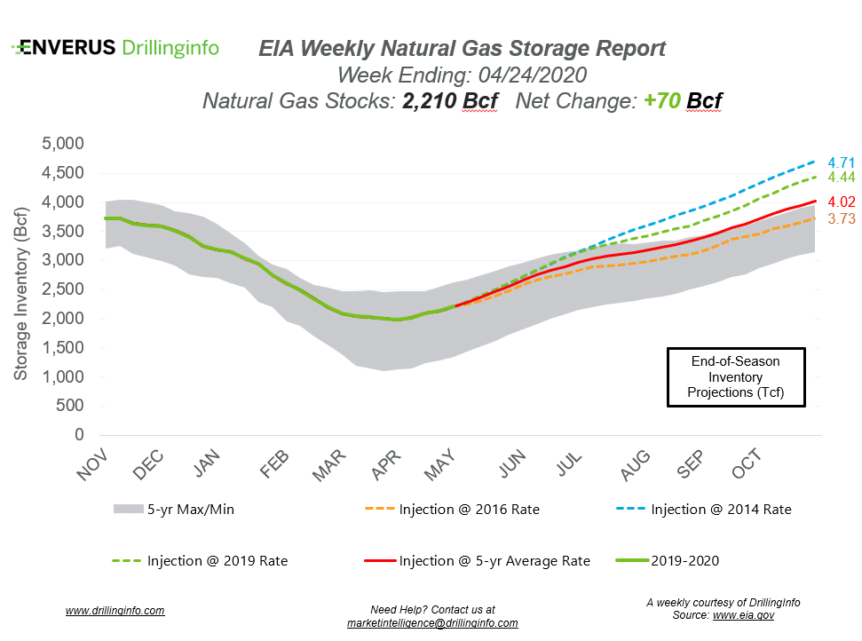 Natural gas storage inventories increased 70 Bcf for the week ending April 24, according to the EIA’s weekly report. This was slightly below the expected injection of 74 Bcf.