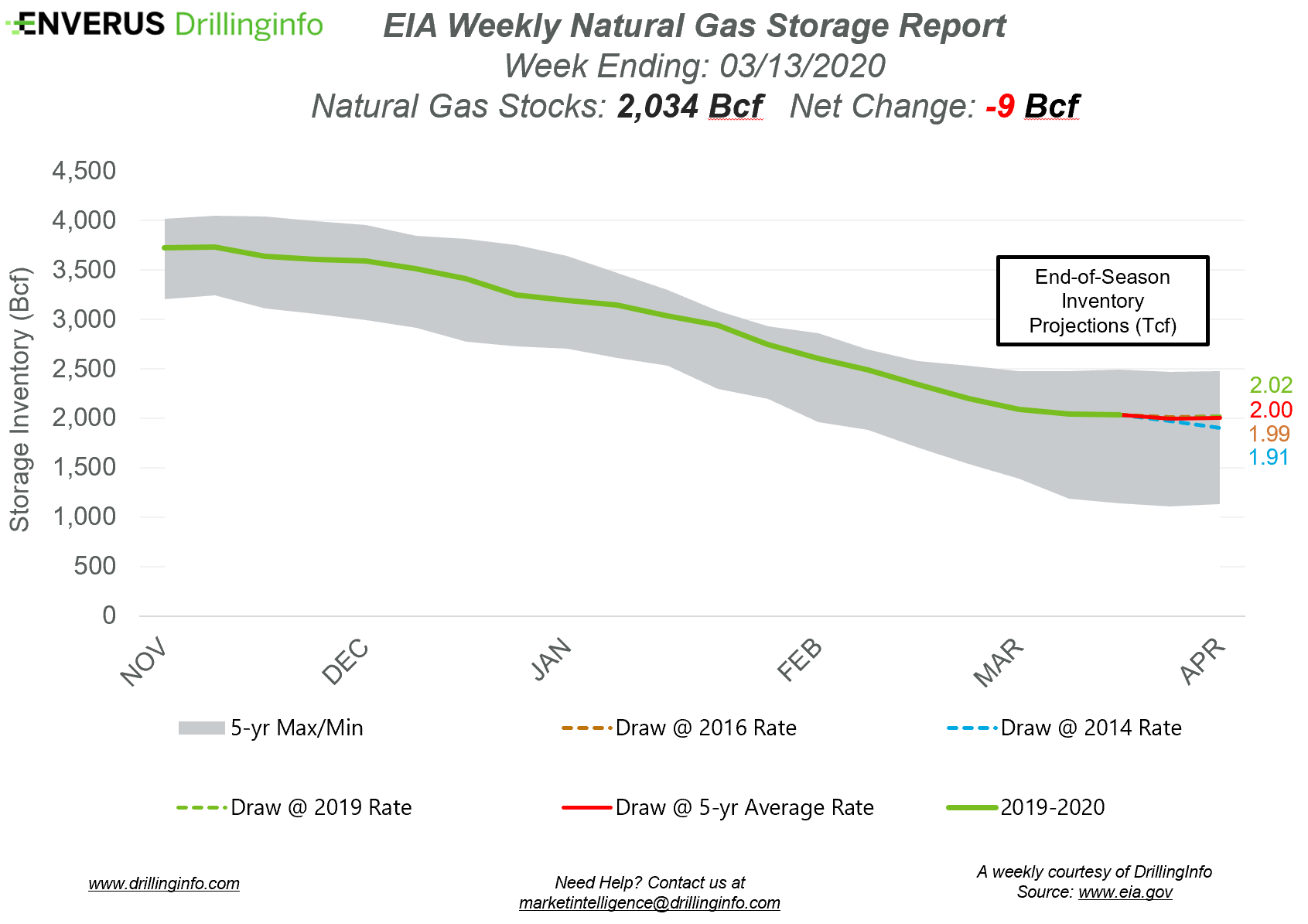 Natural gas storage inventories decreased 9 Bcf for the week ending March 13, according to the EIA’s weekly report. This was larger than the expected draw of 4 Bcf.
