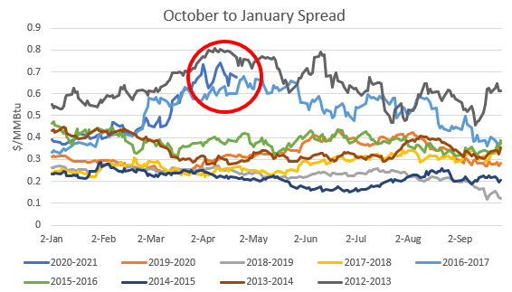 While natural gas prices are currently struggling to find traction to get above $2/MMBtu, the market is pricing an expected shortage of supply come the winter season, which will ultimately bring price gains. A key way to determine what the market is fundamentally expecting to happen with storage during the summer and what supply/demand looks like during the winter is to look at the October-to-January price spread, or the spread from the end of injection season to the peak of winter demand. A wider October-to-January spread indicates the potential that there will not be enough supply to meet demand in the winter months and incentivizes traders to put gas into storage now and take the gas out in January when prices are higher, capturing the spread. As of April 22, the October-to-January spread was sitting at $0.674/MMBtu. The last time this level of spread was seen this early in the year was 2012-2013, when the spread was $0.766/MMBtu, while 2016-2017 fell slightly lower at $0.602/MMBtu. The five-year average of this spread is $0.361/MMBtu for this time of year.