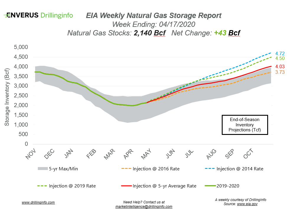 Natural gas storage inventories increased 43 Bcf for the week ending April 17, according to the EIA’s weekly report. This was slightly below the expected injection of 45 Bcf.