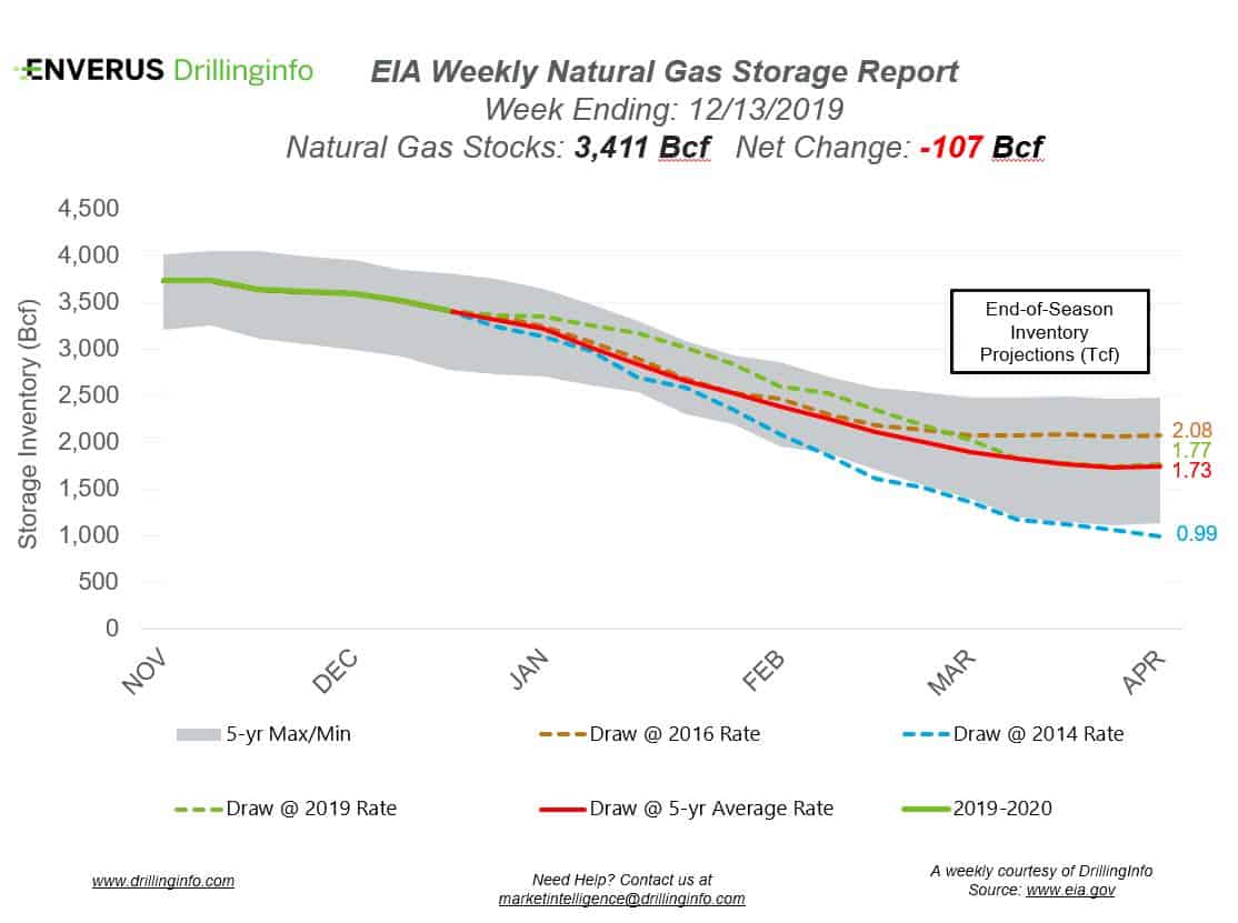 Natural gas storage inventories decreased 107 Bcf for the week ending December 13, according to the EIA’s weekly report. This was above the market expectation, which was a draw of 102 Bcf.