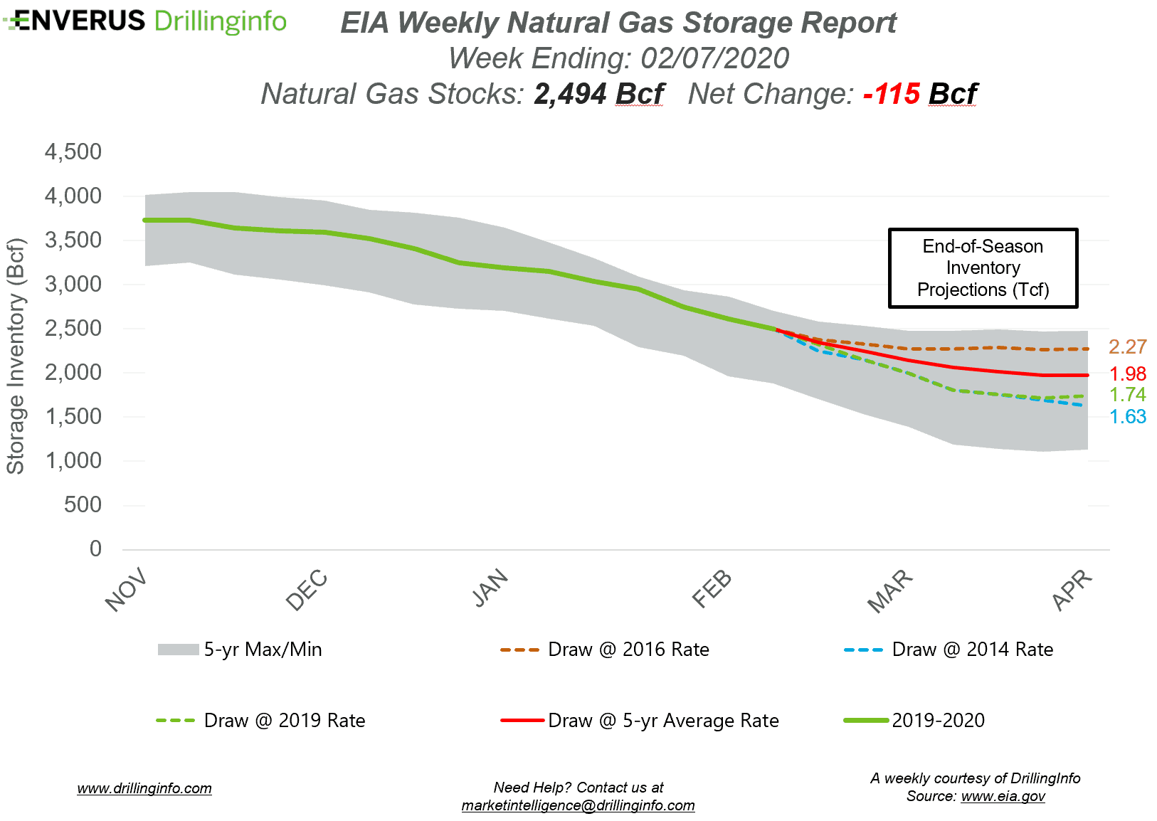 Natural gas storage inventories decreased 115 Bcf for the week ending February 7, according to the EIA’s weekly report. This was more than the expected draw of 110 Bcf.
