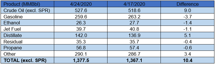US crude oil stocks posted an increase of 9.0 MMBbl. Gasoline inventories decreased by 3.7 MMBbl and distillate inventories increased by 5.1 MMBbl. Yesterday afternoon, API reported a crude oil build of 9.98 MMBbl alongside a gasoline draw of 1.1 MMBbl and a distillate build of 5.5 MMBbl. Analysts were expecting a crude oil build of 10.6 MMBbl. Total petroleum inventories posted an increase of 10.4 MMBbl.