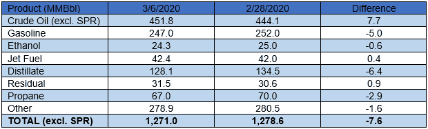 US crude oil stocks posted a large increase of 7.7 MMBbl. Gasoline and distillate inventories decreased 5.0 MMBbl and 6.4 MMBbl, respectively. Yesterday afternoon, API reported a crude oil build of 6.41 MMBbl alongside gasoline and distillate draws of 3.1 MMBbl and 4.7 MMBbl, respectively. Analysts were expecting a smaller crude oil build of 1.85 MMBbl. Total petroleum inventories posted a large decrease of 7.6 MMBbl.