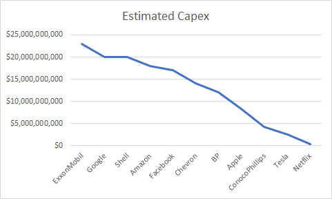 Yet, when you look at the capex our industry has to spend to get critical hydrocarbons into our energy mix, our spend (as measured by the companies shown) is about $73 billion — and our tech companies spend only $66 billion.